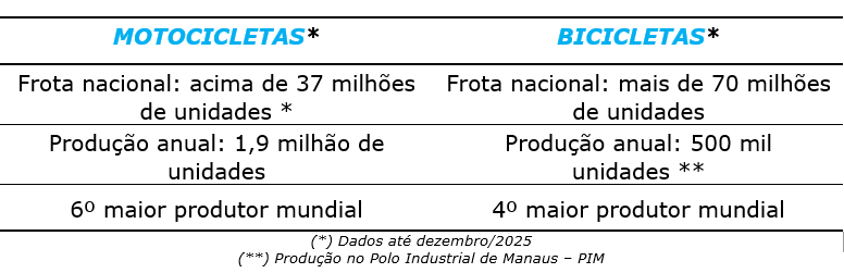 A fabricação nacional de motocicletas, quase totalmente concentrada no Polo Industrial de Manaus (PIM), está entre as seis maiores do mundo. No segmento de bicicletas, com as principais fábricas também instaladas no PIM, o Brasil se encontra na quarta posição entre os principais produtores mundiais. No total, as fabricantes do Setor de Duas Rodas geram 20,9 mil empregos diretos em Manaus/AM e mais de 150 mil indiretos em todo o Brasil.
