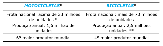 A fabricação nacional de motocicletas, quase totalmente concentrada no Polo Industrial de Manaus (PIM), está entre as sete maiores do mundo. No segmento de bicicletas, com as principais fábricas também instaladas no PIM, o Brasil se encontra na quarta posição entre os principais produtores mundiais. No total, as fabricantes do Setor de Duas Rodas geram 17 mil empregos diretos em Manaus/AM.