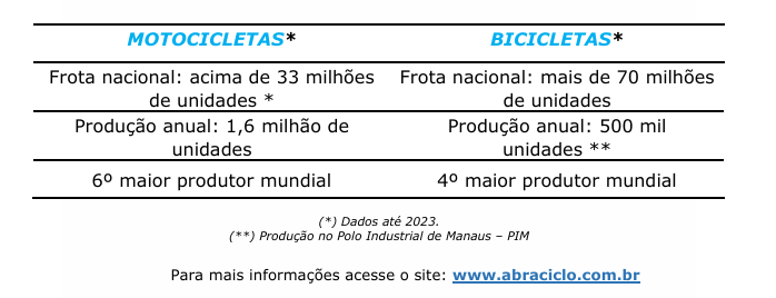 A fabricação nacional de motocicletas, quase totalmente concentrada no Polo Industrial de Manaus (PIM), está entre as sete maiores do mundo. No segmento de bicicletas, com as principais fábricas também instaladas no PIM, o Brasil se encontra na quarta posição entre os principais produtores mundiais. No total, as fabricantes do Setor de Duas Rodas geram 17 mil empregos diretos em Manaus/AM.