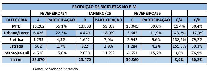 As posições foram mantidas no ranking de fevereiro: MTB (59% do volume produzido), Urbana/Lazer (11,9%) e Infantojuvenil 15,2%).