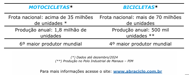 A fabricação nacional de motocicletas, quase totalmente concentrada no Polo Industrial de Manaus (PIM), está entre as seis maiores do mundo. No segmento de bicicletas, com as principais fábricas também instaladas no PIM, o Brasil se encontra na quarta posição entre os principais produtores mundiais. No total, as fabricantes do Setor de Duas Rodas geram 18,7 mil empregos diretos em Manaus/AM e mais de 150 mil em todo o Brasil.