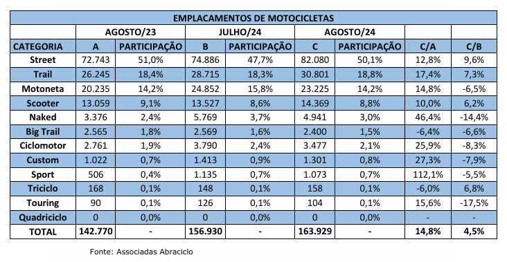 Em agosto, os emplacamentos totalizaram 163.929 unidades, alta de 4,5% em relação a julho e 14,8% na comparação com o mesmo mês do ano passado. Segundo a Abraciclo, esse é o melhor resultado para mês nos últimos 13 anos.
