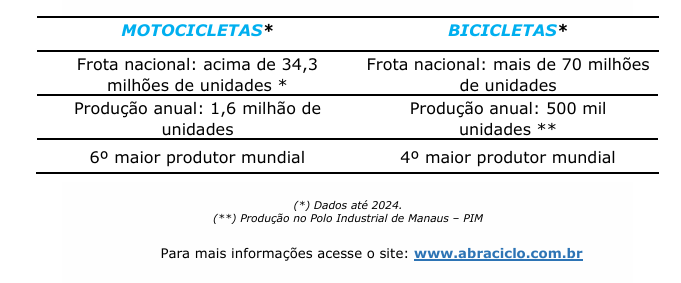 A fabricação nacional de motocicletas, quase totalmente concentrada no Polo Industrial de Manaus (PIM), está entre as seis maiores do mundo. No segmento de bicicletas, com as principais fábricas também instaladas no PIM, o Brasil se encontra na quarta posição entre os principais produtores mundiais. No total, as fabricantes do Setor de Duas Rodas geram 18 mil empregos diretos em Manaus/AM.