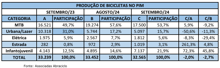 Só em setembro foram fabricadas 32.565 unidades. O destaque segue com a categoria de bicicletas elétricas