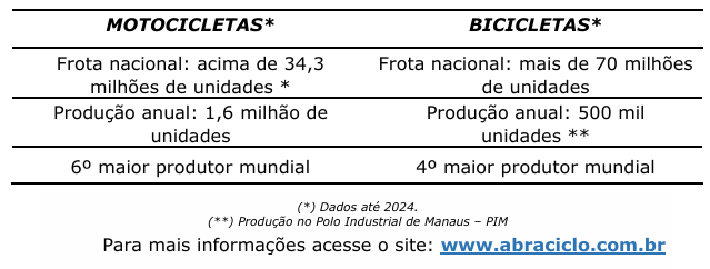 A fabricação nacional de motocicletas, quase totalmente concentrada no Polo Industrial de Manaus (PIM), está entre as seis maiores do mundo. No segmento de bicicletas, com as principais fábricas também instaladas no PIM, o Brasil se encontra na quarta posição entre os principais produtores mundiais. No total, as fabricantes do Setor de Duas Rodas geram 18 mil empregos diretos em Manaus/AM.
