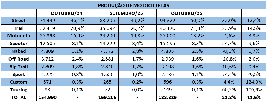 Em outubro, a categoria Street liderou a produção, com 94.322 unidades, o que corresponde a 50% do total fabricado. Na sequência, veio a Trail (com 21,3% de participação), seguida pela Motoneta (com 13,2%).