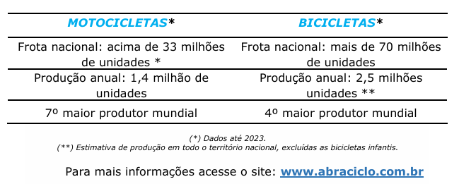 A fabricação nacional de motocicletas, quase totalmente concentrada no Polo Industrial de Manaus (PIM), está entre as sete maiores do mundo. No segmento de bicicletas, com as principais fábricas também instaladas no PIM, o Brasil se encontra na quarta posição entre os principais produtores mundiais. No total, as fabricantes do Setor de Duas Rodas geram 17 mil empregos diretos em Manaus/AM.
