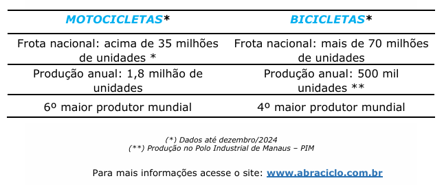 A fabricação nacional de motocicletas, quase totalmente concentrada no Polo Industrial de Manaus (PIM), está entre as seis maiores do mundo. No segmento de bicicletas, com as principais fábricas também instaladas no PIM, o Brasil se encontra na quarta posição entre os principais produtores mundiais. No total, as fabricantes do Setor de Duas Rodas geram 18,7 mil empregos diretos em Manaus/AM e mais de 150 mil em todo o Brasil.