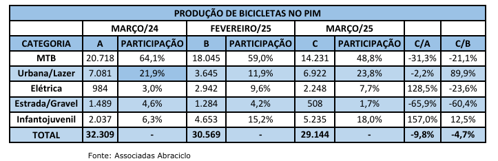 Em março, com menor dias úteis de produção devido ao feriado de Carnaval, 29.144 bicicletas saíram das linhas de produção, retração de 9,8% na comparação com o mesmo mês de 2024 e de 4,7% em relação a fevereiro.