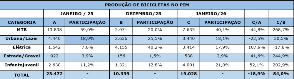 Em janeiro, a Mountain Bike (MTB) liderou o ranking de produção, com 7.635 unidades, o equivalente a 40,1% do volume total. Na sequência, a categoria Infantojuvenil registrou 4.001 unidades (21%), enquanto a Urbana/Lazer somou 3.440 unidades, representando 18,1% da fabricação.