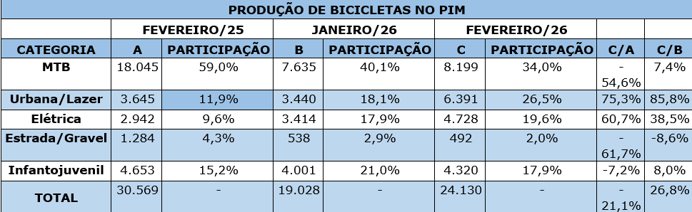 Considerando apenas o mês de fevereiro, foram produzidas 24.130 bicicletas. O volume representa crescimento de 26,8% em relação a janeiro, sendo 21,1% menor na comparação com o mesmo mês de 2025.