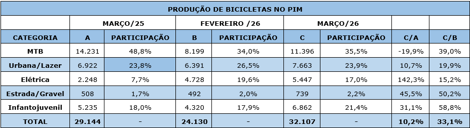 A categoria mais produzida em março foi a Mountain Bike (MTB), com 11.396 unidades e 35,5% do volume total fabricado no período.