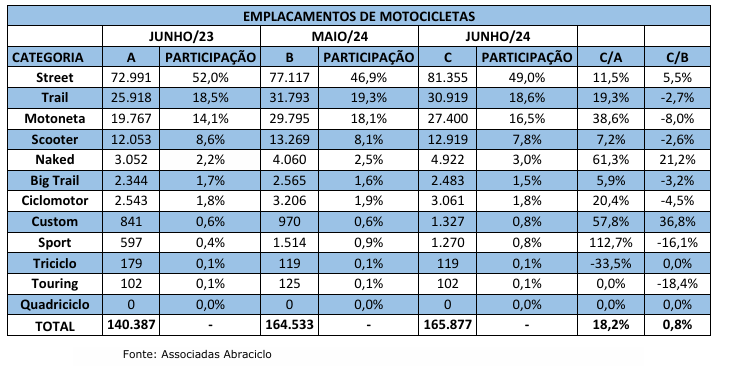 As posições no ranking mensal foram mantidas: Street, com 49% de participação no mercado, seguido pela Trail (com 18,6%) e Motoneta (com 16,5%).
