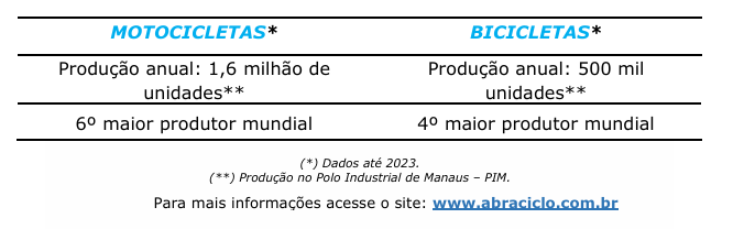 A fabricação nacional de motocicletas, quase totalmente concentrada no Polo Industrial de Manaus (PIM), está entre as seis maiores do mundo. No segmento de bicicletas, com as principais fábricas também instaladas no PIM, o Brasil se encontra na quarta posição entre os principais produtores mundiais. No total, as fabricantes do Setor de Duas Rodas geram 18 mil empregos diretos em Manaus/AM.