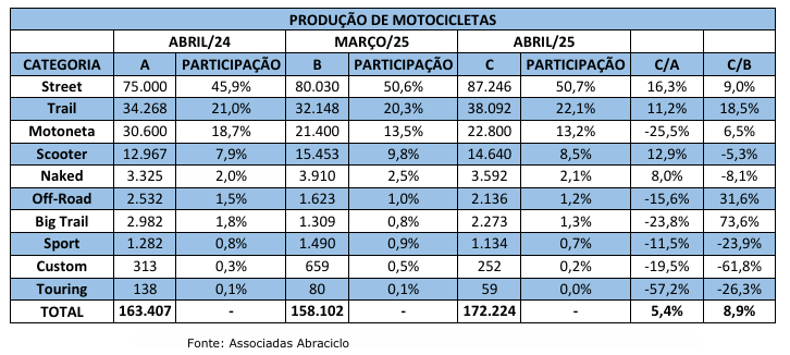Com 51,5% do volume produzido, a Street liderou o ranking das categorias mais fabricadas no primeiro quadrimestre. Em segundo lugar ficou a Trail, com 20,7% da produção, seguida pela Motoneta (13,4%).
