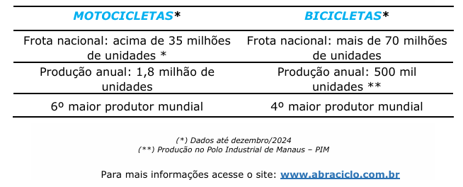 A fabricação nacional de motocicletas, quase totalmente concentrada no Polo Industrial de Manaus (PIM), está entre as seis maiores do mundo. No segmento de bicicletas, com as principais fábricas também instaladas no PIM, o Brasil se encontra na quarta posição entre os principais produtores mundiais. No total, as fabricantes do Setor de Duas Rodas geram 18,7 mil empregos diretos em Manaus/AM e mais de 150 mil em todo o Brasil.