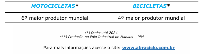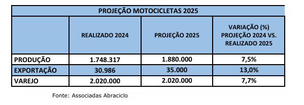 A Associação Brasileira dos Fabricantes de Motocicletas, Ciclomotores, Motonetas, Bicicletas e Similares – Abraciclo estima que as fábricas localizadas no PIM (Polo Industrial de Manaus) deverão produzir 1.880.000 motocicletas em 2025, crescimento de 7,5% na comparação com as 1.748.317 unidades fabricadas no ano passado.