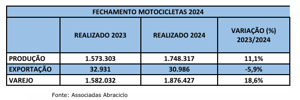 No último mês de 2024, saíram das linhas de montagem 123.944 motocicletas, alta de 5% na comparação com o mesmo mês de 2023 e 15,1% menor em relação a novembro. Segundo a associação, esse foi o melhor resultado para o mês desde 2008.