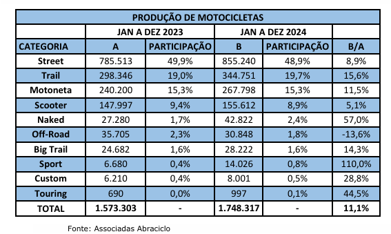 Com 855.240 unidades fabricadas, a Street foi a categoria mais produzida. Esse volume corresponde a 48,9% do total de motocicletas que saíram das linhas de montagem do PIM. A Trail ficou em segundo lugar (19,7%), seguida pela Motoneta (15,3%).