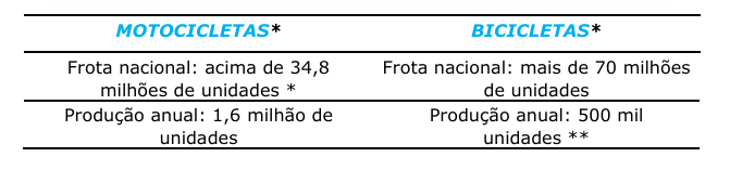 A fabricação nacional de motocicletas, quase totalmente concentrada no Polo Industrial de Manaus (PIM), está entre as seis maiores do mundo. No segmento de bicicletas, com as principais fábricas também instaladas no PIM, o Brasil se encontra na quarta posição entre os principais produtores mundiais. No total, as fabricantes do Setor de Duas Rodas geram 18,3 mil empregos diretos em Manaus/AM e mais de 150 mil em todo o Brasil.