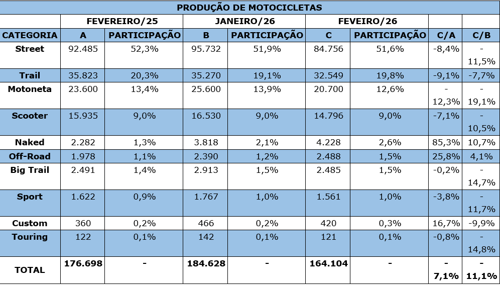 A Street foi a categoria mais produzida no primeiro bimestre. No total, 180.488 unidades saíram das linhas de montagem, o que corresponde a 51,8% do volume fabricado. Em segundo lugar, ficou a Trail (com 19,4% do total produzido), seguida pela Motoneta (com 13,3%).