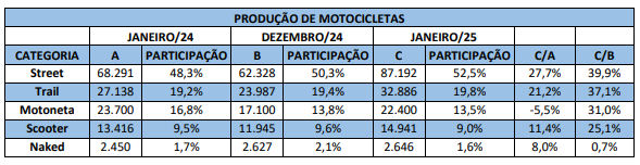 A Street foi a categoria mais produzida em janeiro, com 87.192 unidades e 52,5% do volume fabricado. Em segundo lugar, ficou a Trail (19,8% da produção), seguida pela Motoneta (com 13,5%).