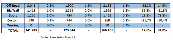 Em termos porcentuais, os modelos de média cilindrada apresentaram o maior crescimento, de 25,5%. “Essa é uma tendência natural do mercado, fruto da demanda dos consumidores por modelos com mais recursos tecnológicos e maior desempenho”, explica Bento.