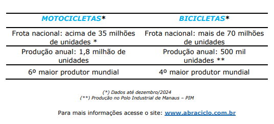 A fabricação nacional de motocicletas, quase totalmente concentrada no Polo Industrial de Manaus (PIM), está entre as seis maiores do mundo. No segmento de bicicletas, com as principais fábricas também instaladas no PIM, o Brasil se encontra na quarta posição entre os principais produtores mundiais. No total, as fabricantes do Setor de Duas Rodas geram 18,7 mil empregos diretos em Manaus/AM e mais de 150 mil em todo o Brasil.