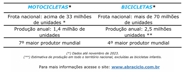 A fabricação nacional de motocicletas, quase totalmente concentrada no Polo Industrial de Manaus (PIM), está entre as sete maiores do mundo. No segmento de bicicletas, com as principais fábricas também instaladas no PIM, o Brasil se encontra na quarta posição entre os principais produtores mundiais. No total, as fabricantes do Setor de Duas Rodas geram 17 mil empregos diretos em Manaus/AM e 150 mil em todo o país.