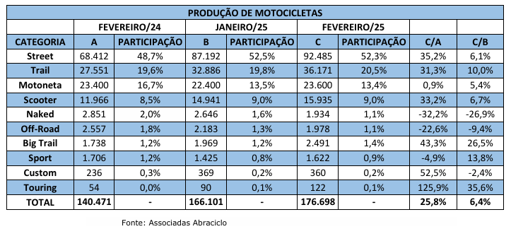 Em fevereiro, foram fabricadas 92.485 motocicletas da categoria Street (52,3% do volume fabricado). Na sequência, vieram a Trail (20,5% da produção), seguida pela Motoneta (com 13,4%).