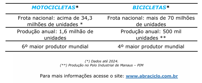 A fabricação nacional de motocicletas, quase totalmente concentrada no Polo Industrial de Manaus (PIM), está entre as seis maiores do mundo. No segmento de bicicletas, com as principais fábricas também instaladas no PIM, o Brasil se encontra na quarta posição entre os principais produtores mundiais. No total, as fabricantes do Setor de Duas Rodas geram 18 mil empregos diretos em Manaus/AM.